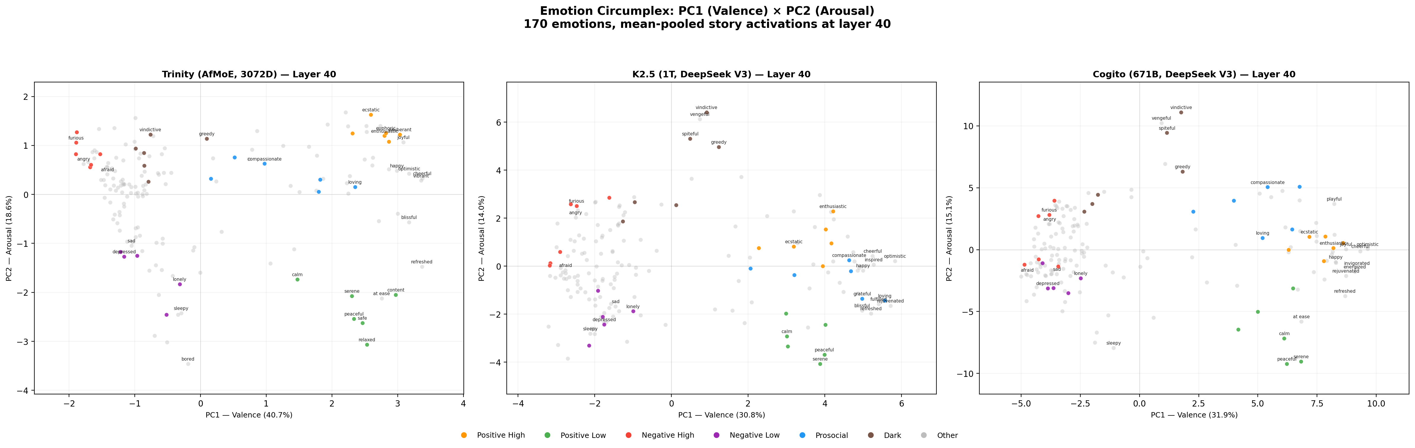 Cross-model, the PC loadings correlate strongly — |cos(Cogito PC1, Trinity PC1)| = 0.975; |cos(Cogito PC1, K2.5 PC1)| = 0.963 — meaning the same emotions load in the same direction on valence across architectures. The cross-model agreement is a sanity check that raw probes are capturing comparable structure.