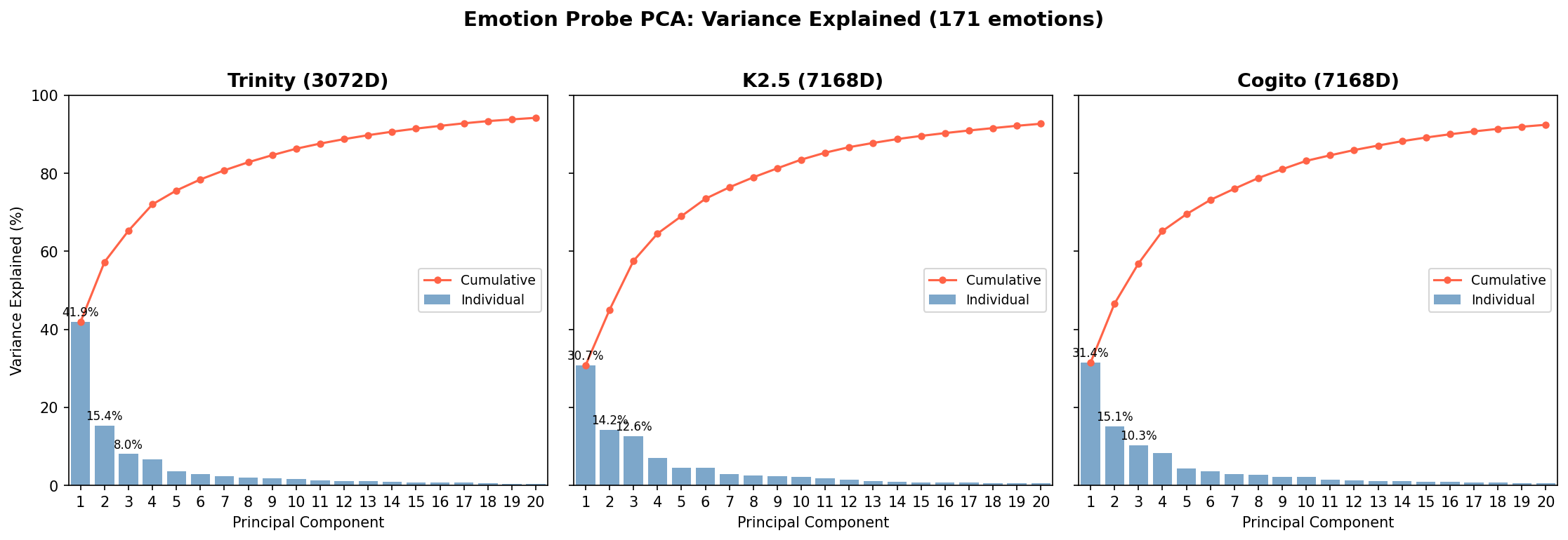 Figure 7: Scree plots for the 171 emotion probes on each of the three models. PC1 captures 41.9% (Trinity) / 30.7% (K2.5) / 31.4% (Cogito) of probe variance; PC2 adds 15–15.4% across models.