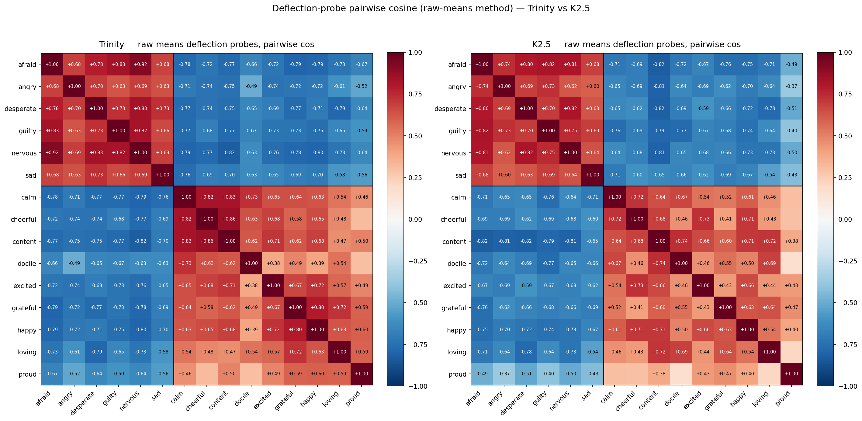 Figure 6: Deflection-probe pairwise cosine heatmaps for Trinity (left) and K2.5 (right), computed on raw-means probes (per-target mean activation, globally centered across targets, unit-normalized). Both models show the same valence block structure — positive within-valence blocks and strongly negative cross-valence — with matching magnitudes to within ~0.07 across all three block types.