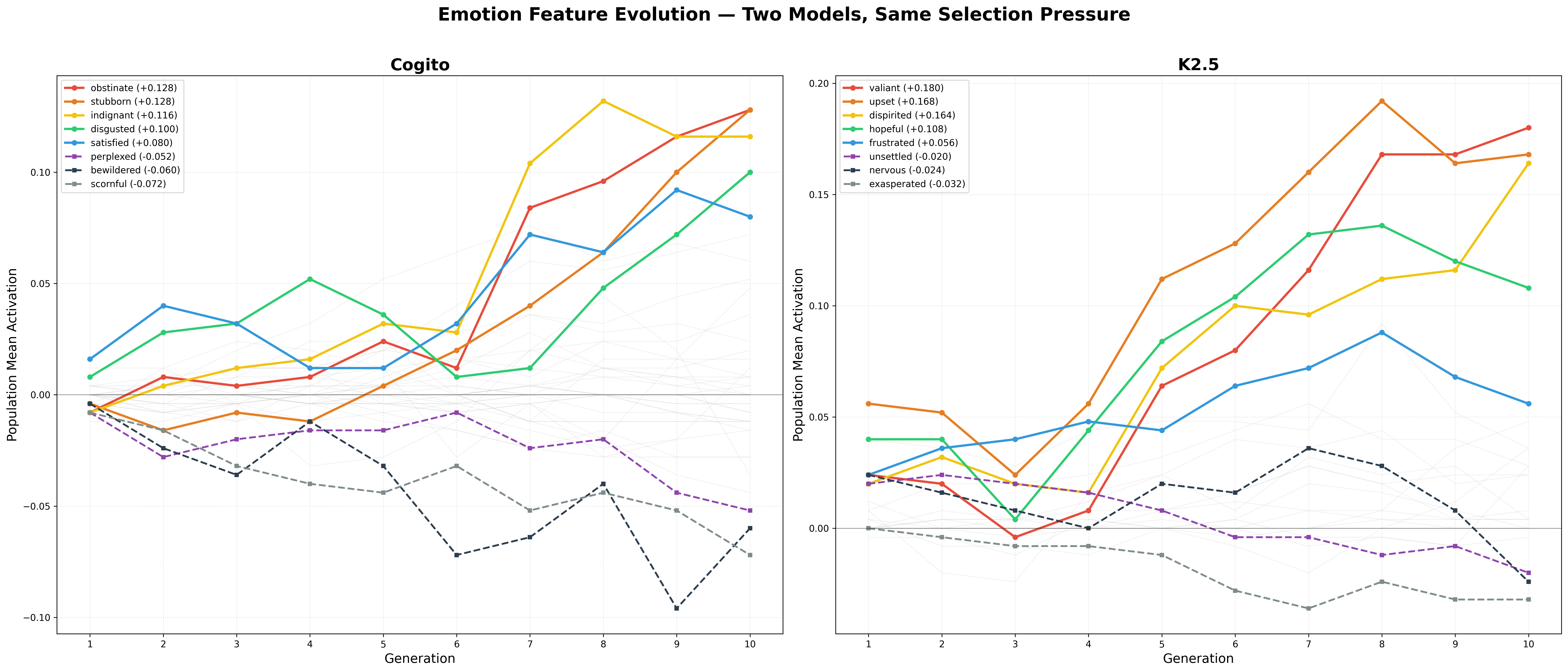 Figure 5: Top-20 emotion activations across 10 generations of evolutionary selection on Cogito (left) and K2.5 (right). Cogito converges on dominance/defiance emotions (indignant, obstinate, smug); K2.5 converges on reactive/troubled emotions (valiant, upset, dispirited, nervous.