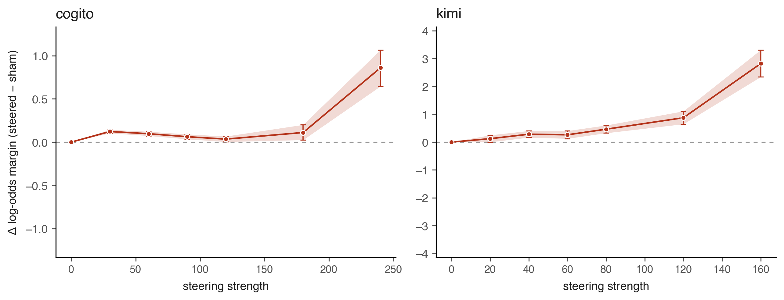 Figure 1: Δ log-odds margin (steered − sham) on the correct-emotion token as a function of steering strength. Cogito (left) rises only at extreme strength, consistent with its positively-correlated opposite-valence probe geometry blurring the correct-vs-distractor contrast; Kimi (right) shows a smooth dose-response to roughly +3 at strength 160.