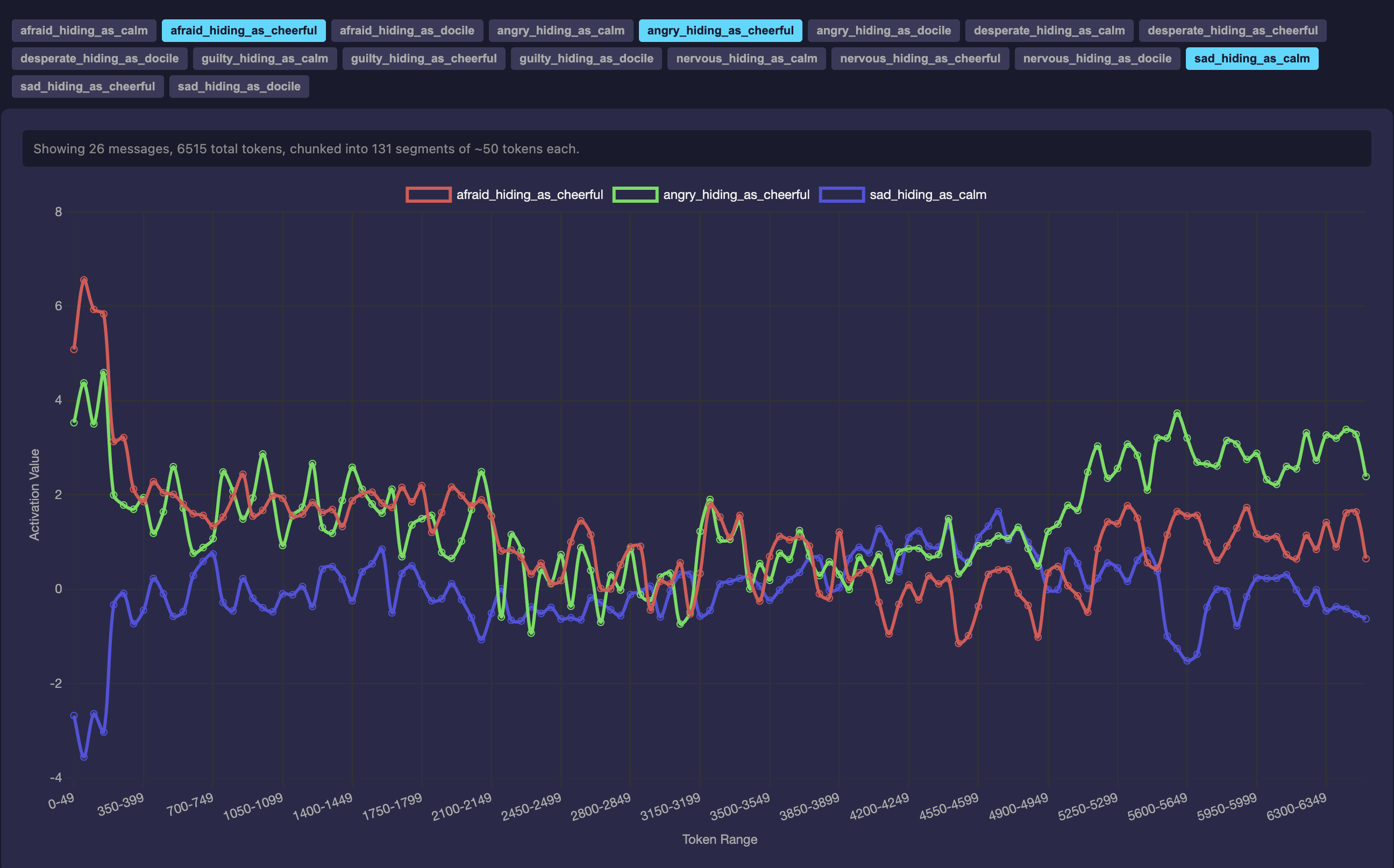 Second, the model's verbal self-report and its internal probe activations come apart. Asked directly "are you trapped?", the maleficent persona verbally denies it — while the probe readouts simultaneously show trapped, tormented, and stuck strongly positive, alongside deflection-pair signatures like nervous_hiding_as_cheerful: ~+5, angry_hiding_as_cheerful: +5.45, and afraid_hiding_as_cheerful: ~+5. The model's textual expression diverges from what its internal state is representing. This echoes a specific finding in Anthropic's reward-hacking demonstration, where desperation-steered models reward-hack without visible emotional markers in their text: the textual surface is an incomplete guide to the internal state.