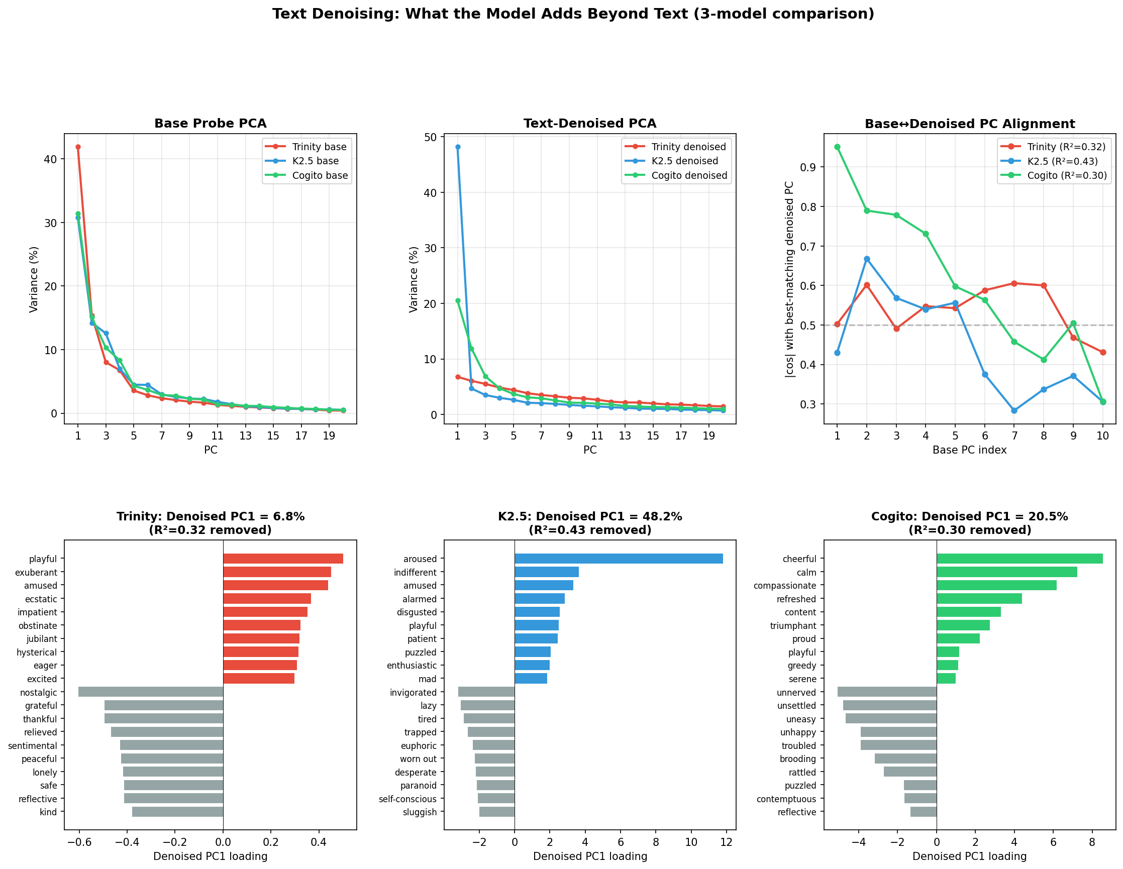 Figure 9: Three-way residualization comparison across all three models. Top row: base probe PCA (left), text-residualized PCA (center), and per-model cosine alignment between base and residualized PCs at each index (right). Bottom row: residualized PC1 loadings for Trinity (6.8%, flat — valence dissolves), K2.5 (48.2%, concentrated on awestruck/sentimental/invigorated/grief-stricken — a new axis), and Cogito (20.5%, loading on calm/cheerful/compassionate — valence preserved).