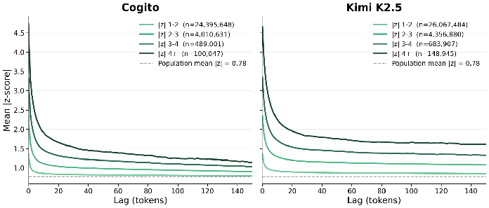 There’s a fast initial dropoff in the first 10 tokens following a strong activation, followed by a steady tail which is elevated above baseline. This isn’t the shape of stateless autocorrelation. These probes are constructed with the effect of Gemini embeddings removed, so we expect that the text’s content isn’t driving these dynamics.