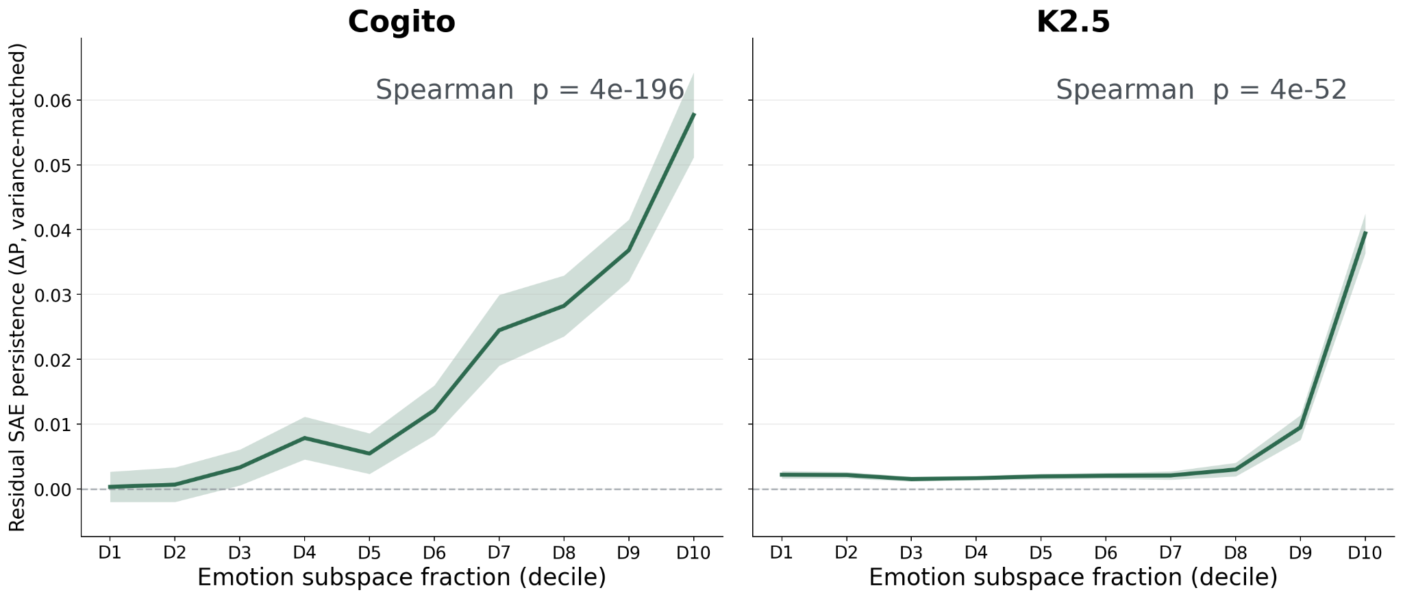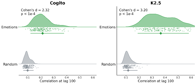 Across 240 multi-turn conversations per model, the 171 emotion probes show correlation between the first and 100th token of 0.214 in Cogito and 0.367 in Kimi, compared to only 0.099 and 0.117 for random unit vectors in the same 7168D activation space. However, emotion probes capture more activation variance than random directions, and high-variance directions are generically more persistent. 5,420 random unit vectors were drawn from the top-k eigenspace of the layer-40 hidden-state covariance for a sweep of k values. Each emotion probe was matched to the 20 of these random vectors with the nearest variance explained. Each emotion probe’s autocorrelation minus the median of its variance-matched neighbors averages +0.077 in Cogito (p = 1.5e-27, 157 of 171 probes positive) and +0.170 in Kimi (p = 6.7e-30, 167 of 171 positive). Persistence was measured across each model’s SAE features by the increase in probability of firing 100 tokens later given that the feature fired now, compared to its base firing rate. The overlap the SAE feature has with the emotion subspace correlates with persistence after controlling for variance effects (Spearman +0.413, p = 4.4e-196 in Cogito, Spearman +0.111, p = 4.4e-52 in Kimi). Agentic self-evaluation of the SAE feature’s effect correlates with persistence after accounting for variance (ρ = +0.124, p = 0.0001).