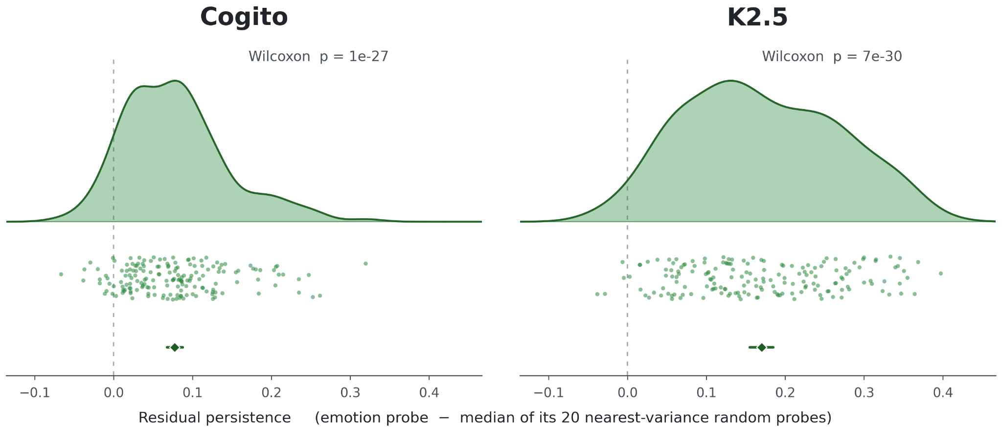 Residual persistence of the emotion probes above that of random, variance-matched directions