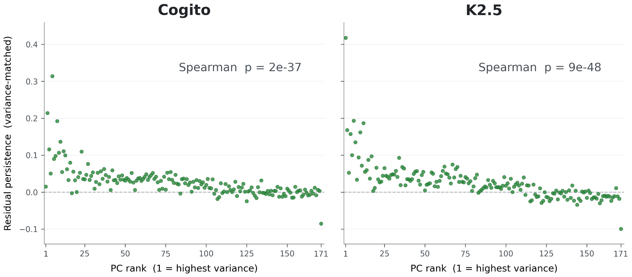 If there was a true connection between the emotion features and persistence, we expect lower PCs of emotions to have higher persistence, since higher PCs are more noisy. If the persistence was an artifact of probe construction or measurement, it’s plausible that the lowest-variance, noisiest PCs have a similar persistence as the more central PCs. We can variance-match each PC with the same method as before, to compute residual persistence. Indeed, lower, more central PCs tend to also be more persistent in both models.