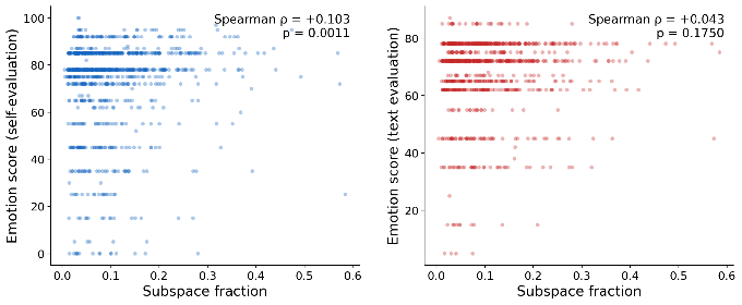The correlation between emotion subspace fraction and self-evaluated emotionality of the feature validates that the emotional concepts of the probes somewhat overlap with the model’s self-reported internal emotions. Manual review of the text- and self-evaluations indicated frequent differences in the interpretation of the feature. The two scores are correlated at only ρ = +0.051 (n.s.). For example, for one of the two 100 score features, the self-evaluation described the effect as “blooming warmth that feels like emotional expansion” when steered positively, and “a profound sense of emptiness” when steered negatively. Yet, the text evaluation described this feature’s positive steering as having a “melancholic” effect