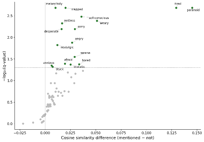 For each of 171 emotion probes, we identified which of the 1,000 SAE features’ self-evaluation transcripts contain that emotion word. We then compared the cosine similarity between the SAE feature and the emotion probe, for features that mention the word versus features that don't. For each emotion mentioned over 4 times, we test whether SAE features whose self-evaluation transcripts mention a specific emotion word have higher cosine similarity than those that don’t mention the word (one-sided permutation test, BH FDR corrected). 17 of 83 emotions had significant associations, and 67 had positive associations, indicating the self-evaluation process is able to successfully assess the emotional content of the probe.