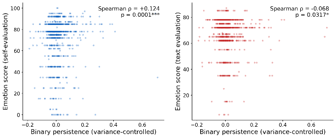 This relationship between persistence and self-evaluated emotionality of the feature does not involve the 171 probes at all, so serves as a replication of the probe-based persistent findings which would not share any potential confounds introduced by probe construction.